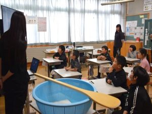 授業の後半で手前に見える大ざるとへらを使って疑似体験をしました