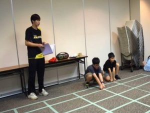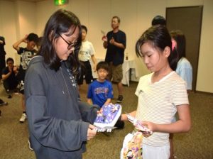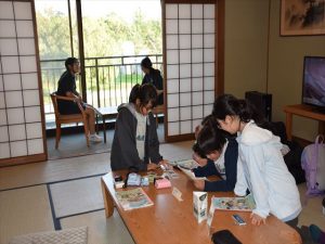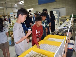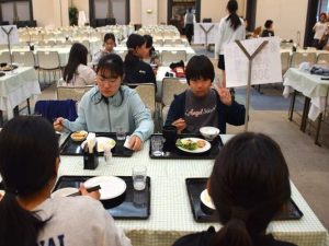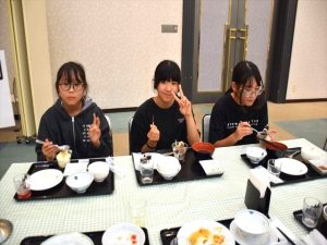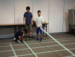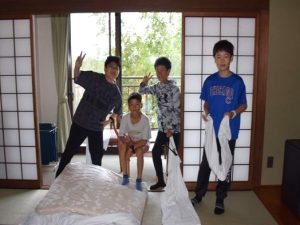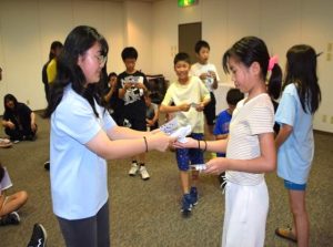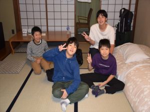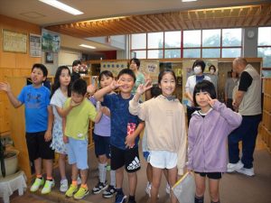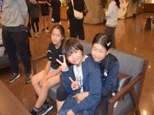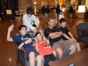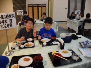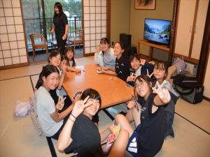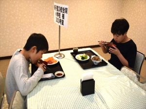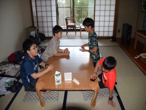 川下りの活動を終えるといよいよホテルグランヴィリオに向かい、入館式でホテルの方との挨拶を済ませ、それぞれの部屋に入りました。自由時間には、部屋交流を行い他校の友達とも活発に交流していました。夕食の場面では、時間になるまで何度もおかわりし食べ続けている子やずっとラーメンなど同じ物を食べている子、食後のアイスクリームなど好きなデザートを楽しむ子様々でした。夜レクは別の階の広い部屋で行いました。各校で行うレクを準備し、順番に楽しみました。川湯小学校は27ます鬼ごっこを行いました。テープを使ってます作りするのが大変でしたが、鬼ごっこになるとよくわからない盛り上がりを見せていました。他のレクのハンカチ落としでは、鬼に追いつこうと必死に走るなど汗だくなりながら活動していました。ビンゴゲームでは、景品をもらって大満足でした。就寝時間になってもガタガタと音は聞こえていましたが、思っていたよりおとなしく過ごしていました。
