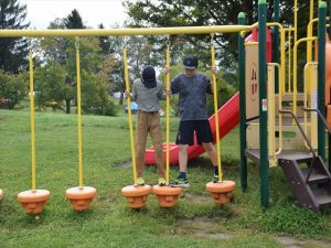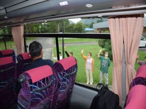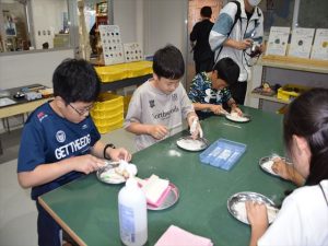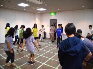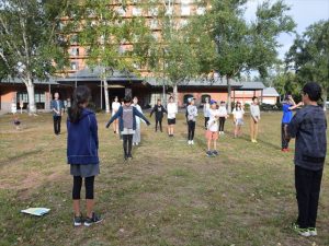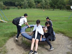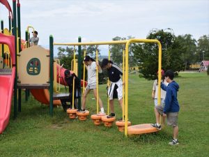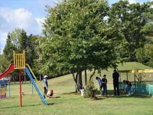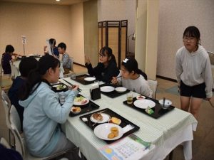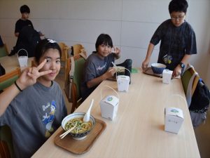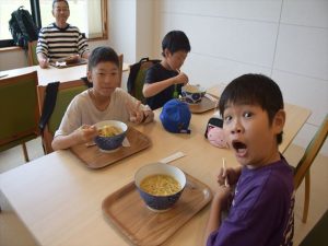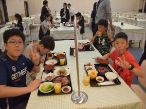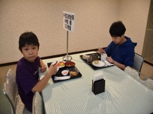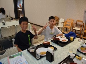 2日目の朝6時に子どもたちを起こしにいくと、すでに起きて後片付けなどをしていました。言われる前に行動できていたのは素晴らしいと感じました。朝の集いをホテル前の公園で行い、ラジオ体操をして爽快な気分で朝食を食べました。バイキング形式なので、しっかりと食べてその後の活動に備えました。