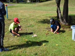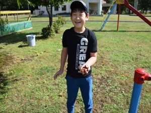 昨年に続いて、今年も学校の農園そばの栗の木が実をつけ、子どもたちが時間を見つけて栗拾いに夢中になっています。高学年の子どもは、火ばさみを使って両足で栗を挟んで上手に栗の実を取っています。それを下の学年の子がまねて取っていました。なんだかほっこりとする光景でした。怪我などないように栗拾いを楽しんでほしいと思います。