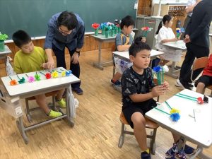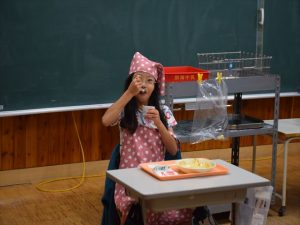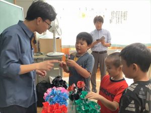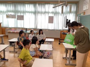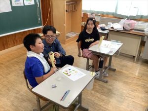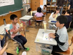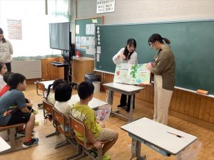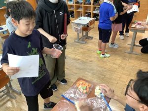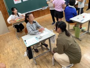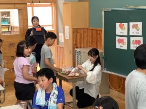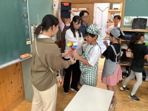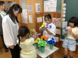 18日(木)は、「弟子屈町イングリッシュウィーク」で玉川大学の学生3名が来校し、外国語活動の授業を行ってくれました。今年度は、高学年が修学旅行のため、1・2年生と3・4年生での実施となりました。1・2年生は「色」のことを学習し、英語での言い方などを教えていただきました。好きな色を選んで花束を作る活動では、自分が好きないるだけではなく、家族の方が好きな色を入れて花束を作る子もいました。3・4年生はクレープ作りを通して、自分がほしい具材を英語を使いもらう学習をしました。最後に子どもたち手作りの花束を渡して感謝の気持ちを伝えていました。玉川大学の学生の皆さん、ありがとうございました。