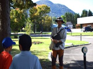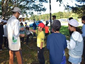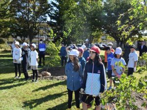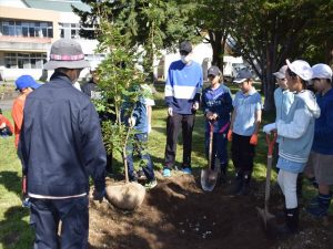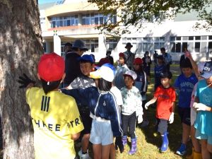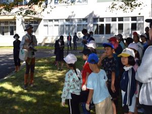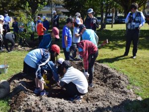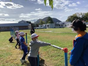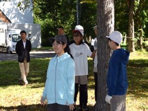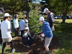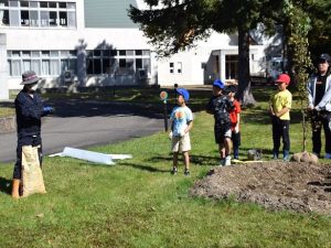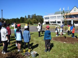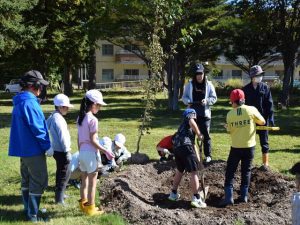 9月30日(火)、全校児童で来年の開校百周年記念を前に記念植樹を実施しました。北海道マイスターガイド木育マイスターの萩原さんを講師にお招きし、木育の学習を行いました。はじめに萩原さんから川湯小学校の敷地内には、多くの種類の木が現存しており、オニグルミや松ぼっくりなどを目当てにエゾリスなどが前庭に来ていることを説明し、その証拠に食べたオニグルミのカラが落ちていることを子どもたちに教えていただきました。その後で樹木クイズ(例:「この中でエルムと呼ばれている木があります。北海道記念保護樹木に指定されている巨木です。探してみてください。」など)を数題出題してくれ、学年対抗で競い合いました。子どもたちは出されるクイズに耳を傾けながら、答えとなる木を探しなっがら楽しく活動しました。その後で、谷口種苗さんにイタヤカエデの植樹の仕方を説明いただき、実際に学級ごとに分かれて植える作業を行いました。仕事を分担しながら学級ごとに力を合わせて行うことができました。講師の萩原さん、谷口種苗さんをはじめご参加いただいた皆様ありがとうございました。植樹活動の2回目は、来年の5月中旬から下旬に桜を植える予定です。