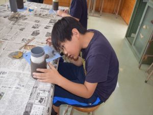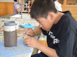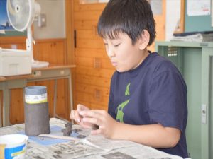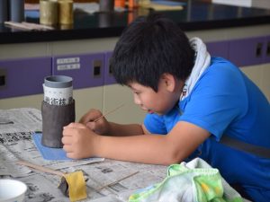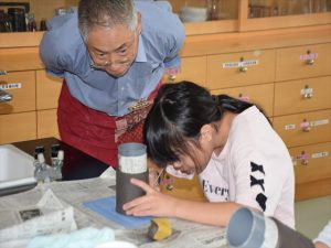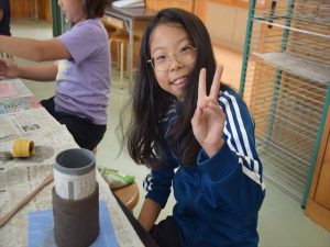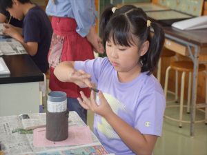 10月1日(水)、多夢窯《たむがま》の平出ご夫妻と德永様を講師としてお招きし、3・4年生の子どもたちを対象に陶芸教室を実施しました。今回はコップを作ったのですが、講師の先生から「世界で一つしか無い自分の作品を作ろうね。」とお話しされなると、子どもたちも制作意欲に火がついたようで、真剣な顔で作品作りに取り組んでいました。良い作品に仕上げようと時には近くにいる講師の先生に、「これでいいですか。」だどと積極的に声をかけ、自分の作品を見ていただいていました。最後に絵を描いたり、あまった粘土を使って模様などをつけたりするなど、思い思いに仕上げ満足のいく作品を作ることができたようです。講師の先生に子どもたちから「作品がいつ仕上がるのか教えてほしい。」と質問がありました。先生から釉薬をつけたり素焼きをしたりするなど、今後の仕上げの工程を教えていただきました。最後に「でもなるべく早く仕上げるね。」と言われ、とても嬉しそうな顔をしていました。講師の先生、お忙しいところ本当にありがとうございました。作品の仕上がりを楽しみにしています。