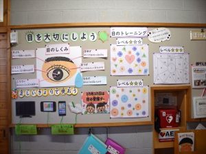 毎年10月10日は目の愛護デーだとご存じでしたか。この日は、目の健康を考えトラブルに対する意識を高めるためにつくられたそうです。目が悪くなったり、不自由になったりしたら大変です。学校でも保健室前に子どもたちに目を大切さに気づいてもらうために掲示しました。テレビを見る距離や本を読むときに注意しなければいけないことを理解し、自分でできることを考え目を大切にする意識が少しでも高まればと考えます。