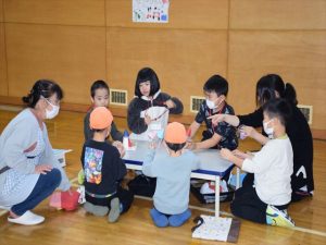 11月19日(水)、ましゅうランドを行いました。計画では、川湯保育園、こども園ましゅうの年長さんを弟子屈小学校、川湯小学校、和琴小学校、美留和小学校の1・2年生が招待する予定でした。しかし、インフルエンザが弟子屈地区で流行っていたため、大変残念でしたが今年に限り、川湯保育園と川湯小学校、和琴小学校、美留和小学校のグループとこども園ましゅうと弟子屈小学校の2グループに分かれて実施することにしました。参加人数は少なくなりましたが、糸電話やロケット、磁石で動かす車、おみくじ、落ち葉を魚を作って釣りをしたり、はてなボックスなど、どの学校も工夫を凝らした出店を出してくれました。川湯保育園の子どもたちや出店に来たお客さんににやり方などをやさしく丁寧に説明したり、それぞれの出店を回りながら交流をしたりして、楽しくましゅうランドを終えることができました。他の学校では準備していただいた先生方、本当にありがとうございました。