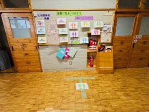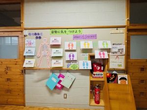 2611月 2025 姿勢に気をつけよう by admin 保健室の掲示が変わりました。今回は「姿勢について」子どもたちに意識してもらうためのものです。工夫している点は、ただ読んで理解するだけではなく、自分の背骨の状態を簡単にチェックできることです。子どもたちも登校した時や休み時間などに掲示を読み、今の背骨の状態をチャックしています。これからも健康に関してどんな掲示がされるか楽しみにしています。 このように足形の上で目をつぶって50階足踏みをすることでチェックができるのです。 Posted in: 未分類
