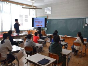 2月9日(月)、学校薬剤師の江畑様を講師にお招きし、高学年を対象とした薬物乱用防止教室を実施しました。薬を乱用することで、体に悪影響を及ぼすことを学びました。危険な薬物としては覚醒剤や大麻などがあり、それ以外の危険ドラッグなども興奮状態になったり、幻覚を見たりするため使用が禁止されていることを教わりました。大麻グミやゾンビタバコなどは、初めは規制がありませんでしたが、体に害をなすことがわかり、使用、所持、販売が禁止になり、絶対に服用してはいけないと強くお話されていました。また、市販されているタバコやアルコールについては、タバコは吸うと人体に悪影響を及ぼすため立派な薬物で吸わないようにと説明を受け、子どもたちは江畑さんの説明を自分事として真剣に聞いていました。今回の授業から「タバコは体に悪いので、大人になっても吸いません。」などの感想が挙げられていました。江畑様、お忙しい中ありがとうございました。